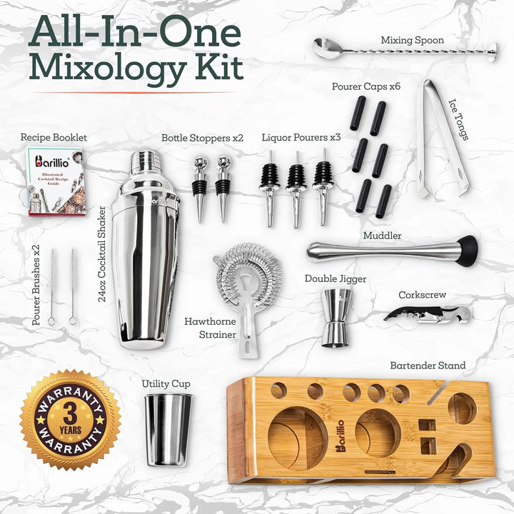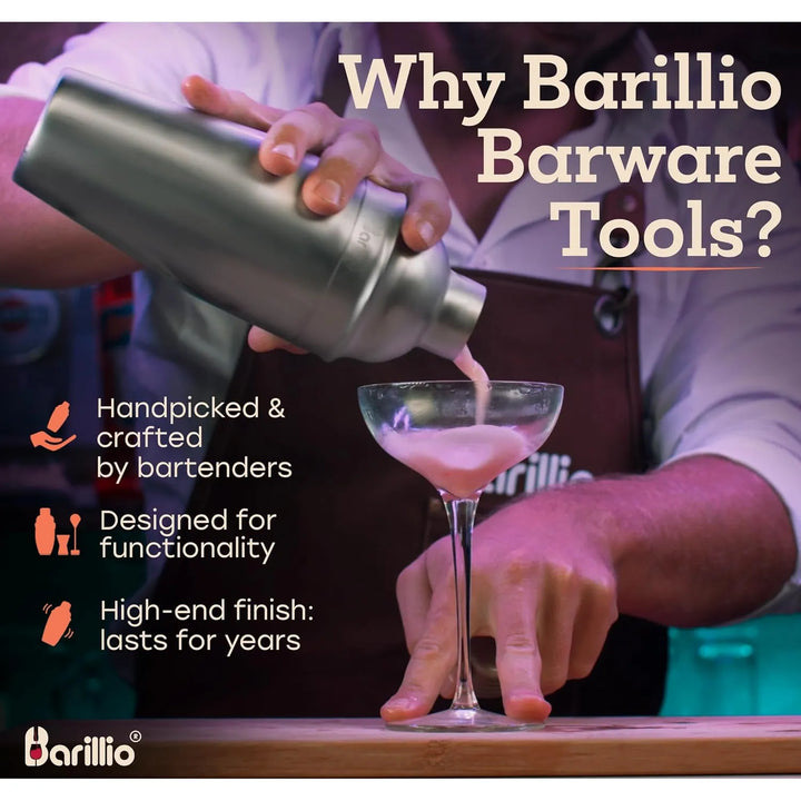 El Kit Barillio está diseñado para simplificar la creación de bebidas sofisticadas. Su coctelera de acero inoxidable sella los sabores, mientras el colador Hawthorne filtra impurezas. El muddler extrae esencias de hierbas y frutas, y los vertederos aseguran un flujo perfecto. Cada herramienta trabaja en armonía para resultados de barra profesional.