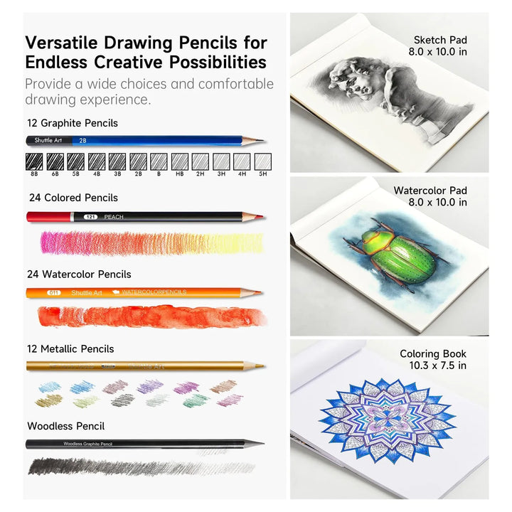 Este kit está diseñado para simplificar tu proceso creativo. Los lápices de alta calidad permiten un deslizamiento suave sobre el papel, mientras que las herramientas adicionales como sacapuntas, borradores y pinceles te ayudan a perfeccionar cada detalle. El estuche portátil garantiza que todo esté organizado y listo para usar en cualquier momento.