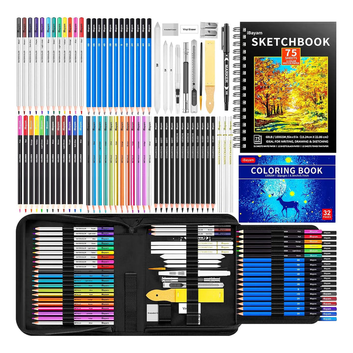 El bloc de bocetos de 3 colores (blanco marfil, bronceado y negro) te permite experimentar con diferentes fondos y efectos, mientras que el libro para colorear con 32 diseños es perfecto para momentos de relajación o práctica. Todo viene organizado en un estuche portátil con cremallera, manteniendo tus herramientas seguras y accesibles dondequiera que vayas.