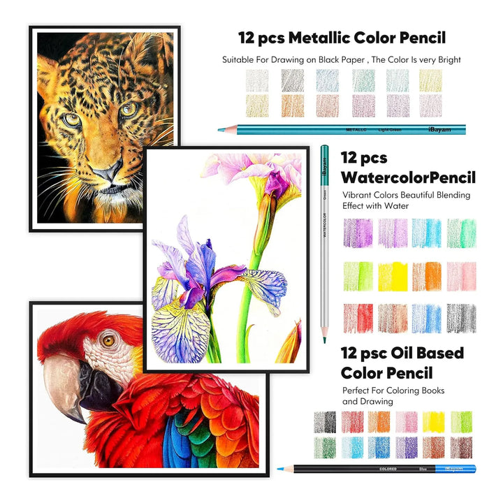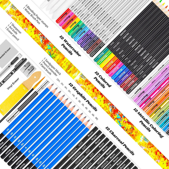 Olvídate de comprar materiales por separado o de invertir en productos de baja calidad. Este kit completo incluye 12 lápices de grafito (desde 2H hasta 8B), 12 lápices de colores, 12 lápices de acuarela, 12 lápices de carbón, 3 lápices de carbón blanco y 12 lápices metálicos. Cada herramienta está cuidadosamente seleccionada para ofrecerte un rango completo de expresión artística.