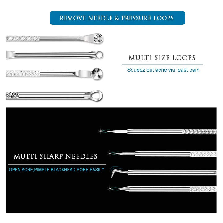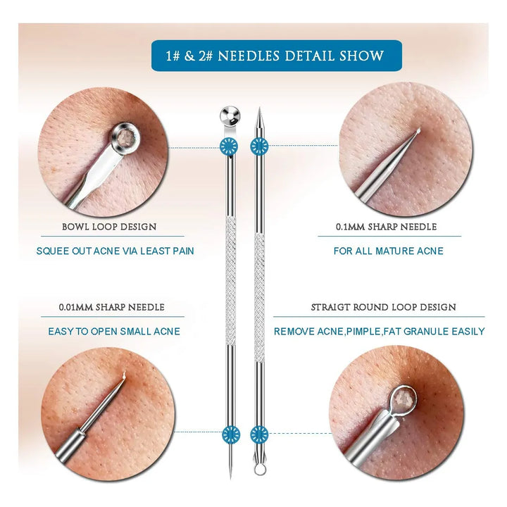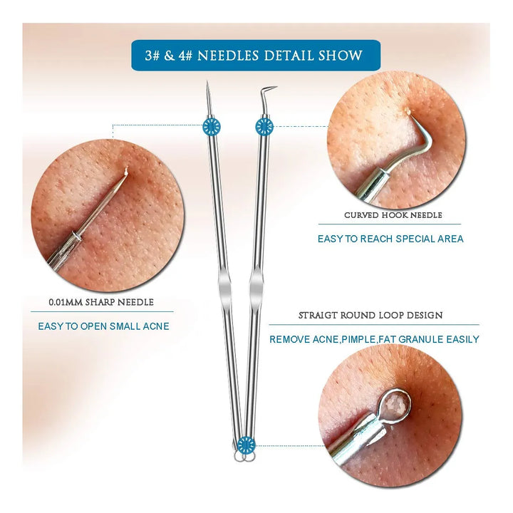 Este extractor de comedones de acero inoxidable de alta calidad está diseñado para eliminar puntos negros, puntos blancos y granos de manera rápida y efectiva. Olvídate de los métodos dolorosos y poco efectivos. Con sus 6 herramientas de doble cabezal, podrás atacar las imperfecciones de diferentes tamaños sin dañar tu piel.