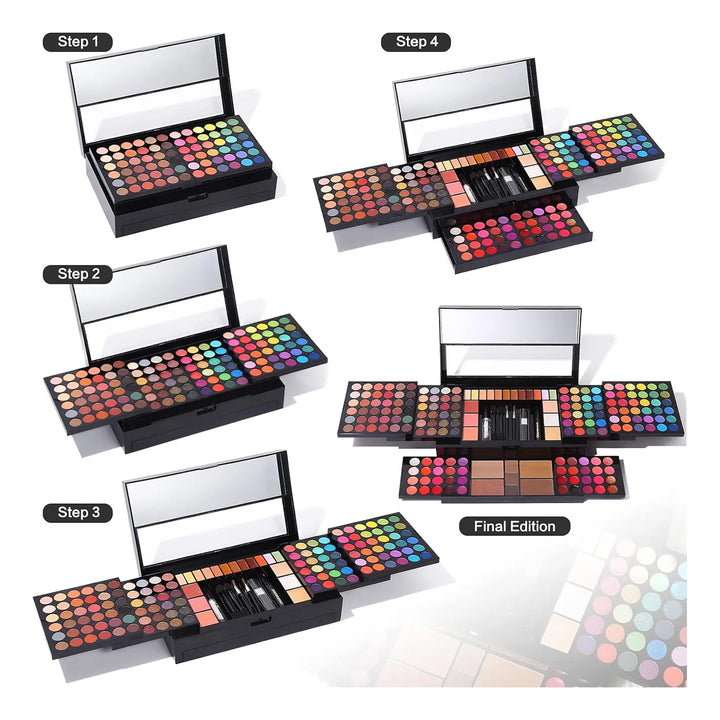 - 🎨 Paleta completa: 72 sombras mate, 48 brillantes, correctores, rubores y más. ¡Todo en un solo lugar!