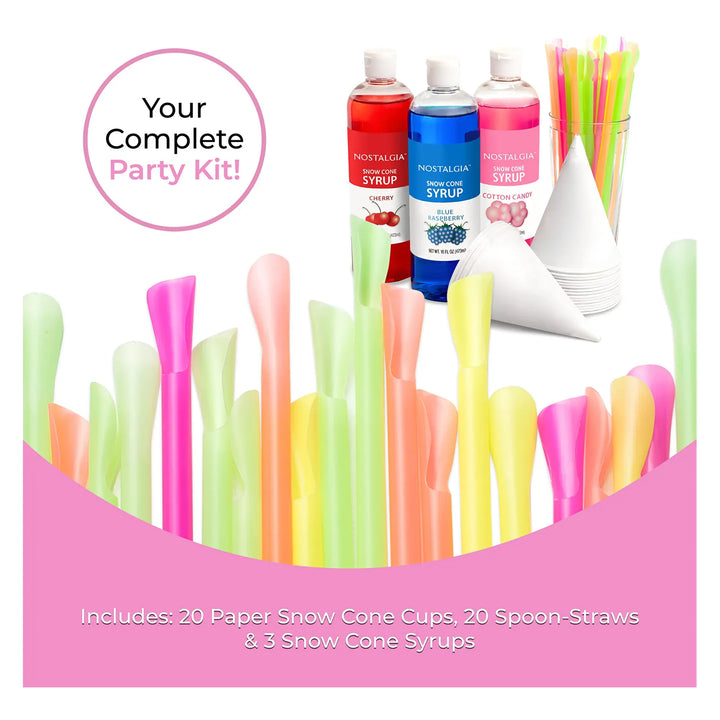 El Kit Nostalgia Fiesta Conos Nieve Premium está diseñado para simplificar tu vida mientras creas momentos inolvidables. Primero, llena los conos con hielo afeitado usando tu máquina de conos de nieve o granizados. Luego, vierte el jarabe de tu elección sobre el hielo. Finalmente, entrega a tus invitados junto con las cucharas/pajitas incluidas y observa cómo sus caras se iluminan con alegría.