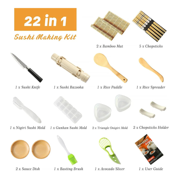 - 🎯 Todo en uno: 22 piezas esenciales para crear sushi como un profesional, sin necesidad de comprar herramientas adicionales.