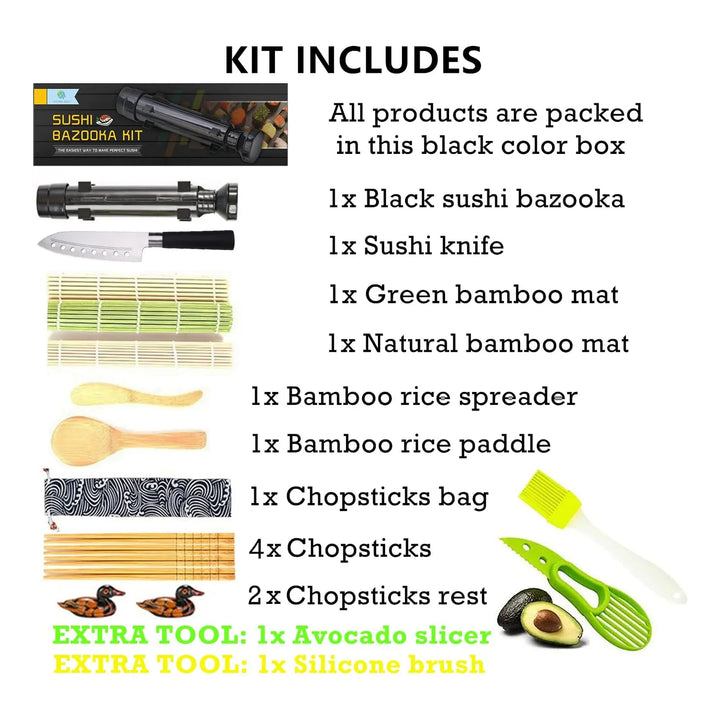 - 🎯 Todo en uno: Incluye bazuca, alfombrillas, palillos, cortador de aguacate y más. ¡Nada se queda fuera!
