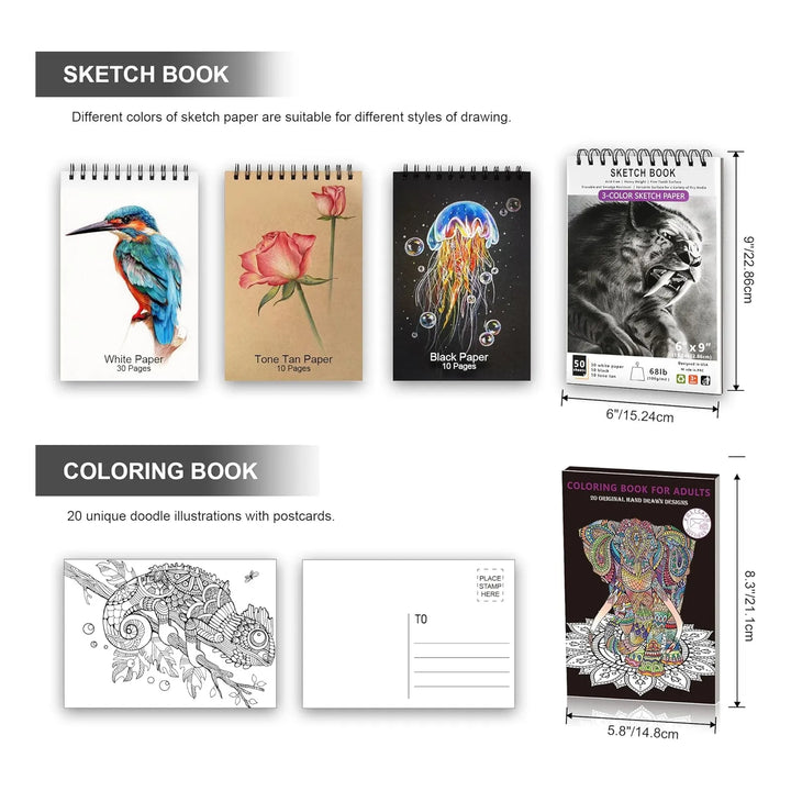 El cuaderno de bocetos de 3 colores incluido es tu lienzo para experimentar. Papel blanco, tostado y negro te permiten jugar con contrastes y efectos únicos, mientras que el libro para colorear con ilustraciones de garabatos convierte cada sesión en una aventura. Además, su estuche resistente al agua garantiza que tus herramientas estén siempre protegidas, listas para llevarlas contigo a donde quiera que vaya tu inspiración.