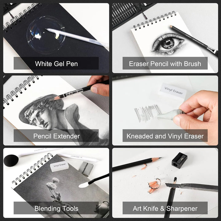 Este juego de dibujo está diseñado para simplificar tu proceso creativo. Los lápices de alta calidad permiten sombrear y mezclar con facilidad, mientras que los accesorios incluidos, como los tocones de mezcla, te ayudan a lograr degradados profesionales. El cuaderno de bocetos con papeles de distintos colores te invita a experimentar con luces y sombras, añadiendo profundidad a tus obras.