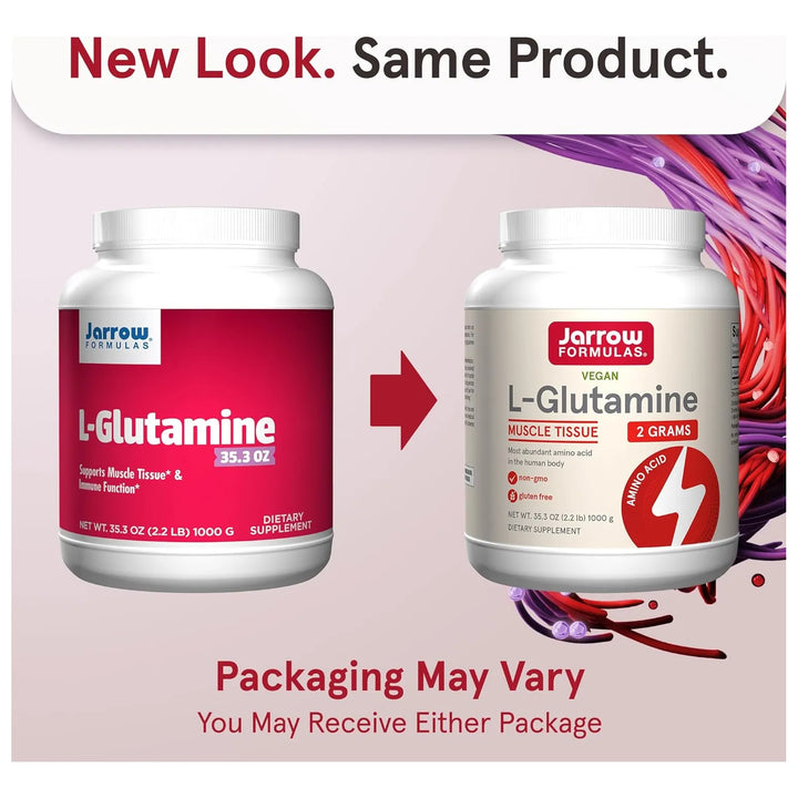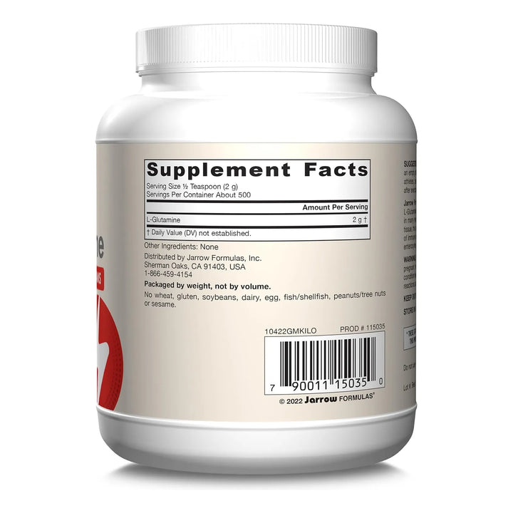 • El tejido muscular, aminoácido multifuncional, suplemento de soporte inmune*: contiene un contenedor de 1000 g (2.2 lb) de fórmulas de jarrow l-glutamina 2 g de polvo para aproximadamente un suministro de 500 días.