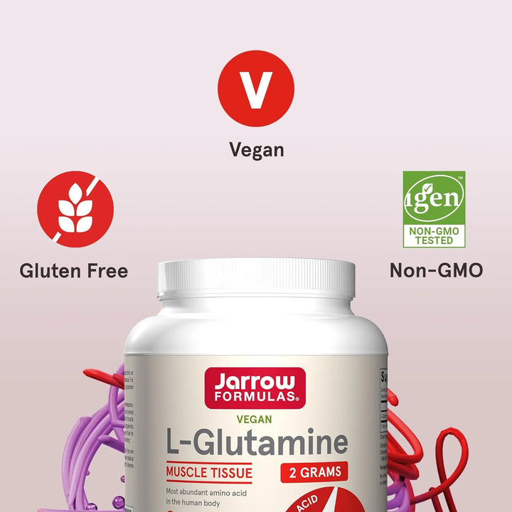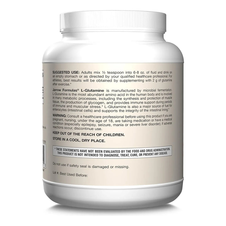 Las fórmulas de Jarrow L-glutamine en polvo ofrecen una alternativa a las tabletas de suplemento para apoyar la producción de glucógeno, la síntesis y la protección del tejido muscular y el apoyo inmune durante los períodos de estrés muscular.* Hecho con ingredientes de alta calidad y no transgénicos, este vegano y sin gluten y la dieta sin gluten y glutenEl suplemento no contiene trigo, soja, lácteos, huevo, pescado, mariscos, maní, nueces de árbol o sésamo.Perfecto para atletas y personas que buscan ayudar a su salud inmune e intestinal, este suplemento en polvo proporciona 2 g de 99% de L-glutamina por porción sin otros ingredientes.* L-glutamina es un aminoácido utilizado en los músculos, el sistema inmune, ytracto intestinal.* Como una fuente importante de combustible para las células intestinales, la l-glutamina también respalda la integridad del revestimiento intestinal.* Uso sugerido: adultos, mezcla 1/2 cucharadita en seis a ocho onzas de líquido y bebida cuando el estómago estávacío o según lo indique su profesional de salud calificado.Atletas, suplemento con 2 g de glutamina después del ejercicio para obtener resultados máximos.