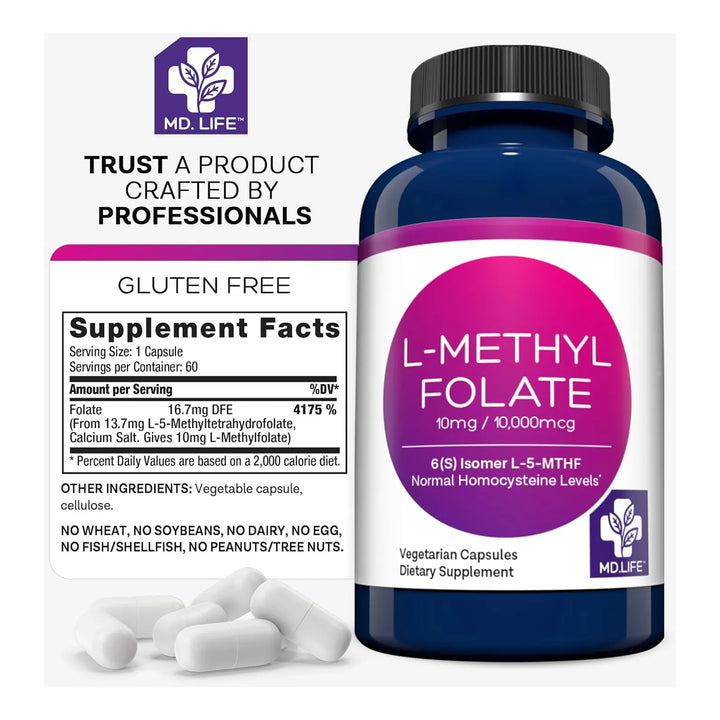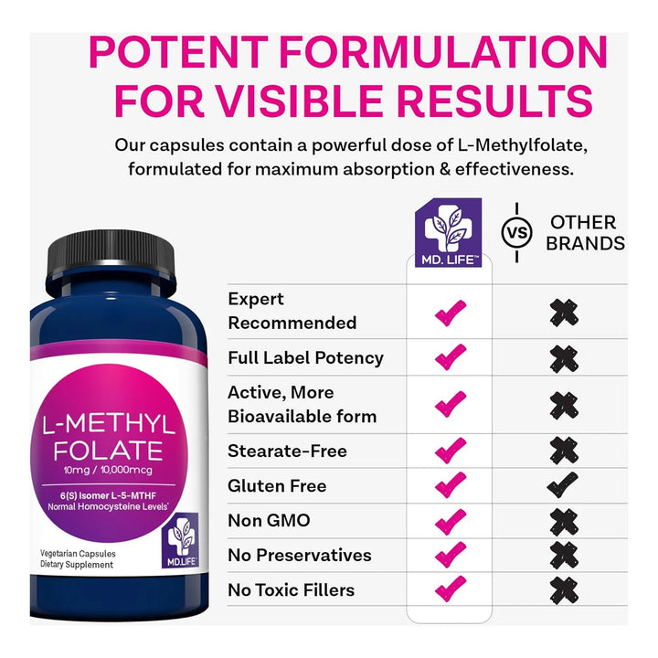 - 💪 Potencia Máxima: 10 mg de L-Metilfolato activo por cápsula, ideal para necesidades específicas.