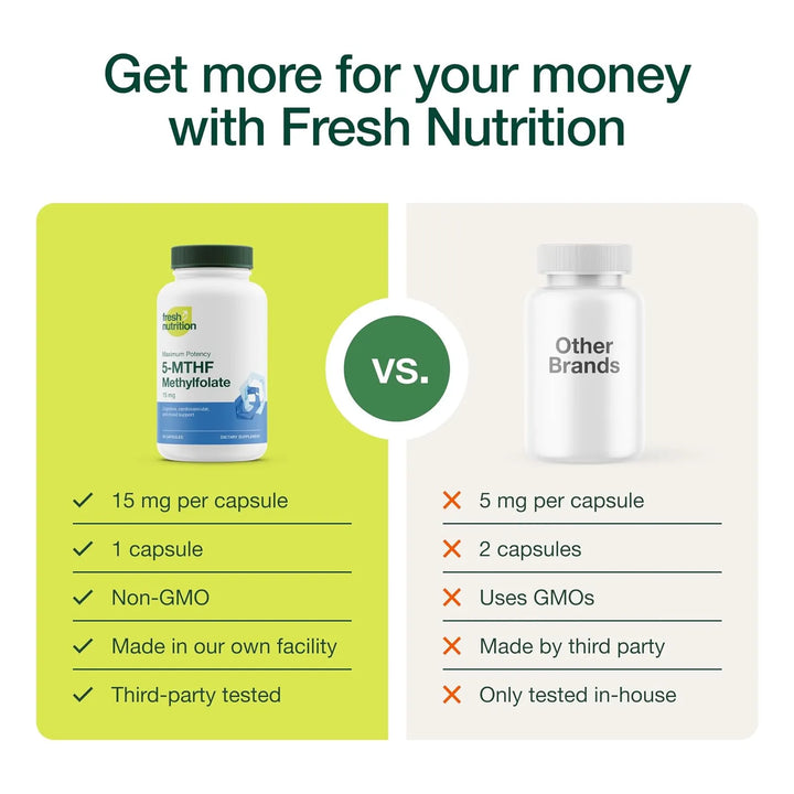 Este suplemento proporciona la forma activa de folato (5-MTHF) que tu cuerpo puede utilizar inmediatamente, sin necesidad de conversión metabólica. Esto lo hace ideal para personas con dificultades para procesar el ácido fólico convencional. Al apoyar procesos clave como la síntesis de ADN y la producción de neurotransmisores, contribuye a tu bienestar general.