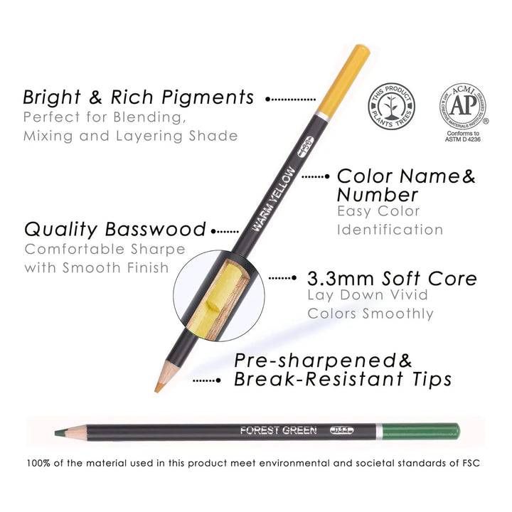 ¿Cansado de lápices que se rompen fácilmente o no logran los colores intensos que deseas? Estos lápices están diseñados para artistas como tú, que buscan calidad y durabilidad. Su núcleo resistente y cuerpo de tilo garantizan un uso prolongado sin sacrificar la intensidad del color. Además, cada lápiz está etiquetado con su nombre y número, para que nunca pierdas tiempo buscando el tono perfecto.