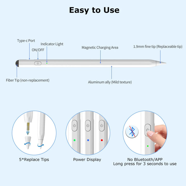Este lápiz óptico transforma tu experiencia con el iPad al ofrecer una precisión y sensibilidad que se adapta a tus necesidades creativas. La punta fina detecta cada movimiento con exactitud, permitiéndote crear trazos detallados, mientras que la punta de fibra conductiva asegura que siempre tengas una opción funcional, incluso sin batería. Su carga rápida y larga duración garantizan que esté listo cuando lo necesites.