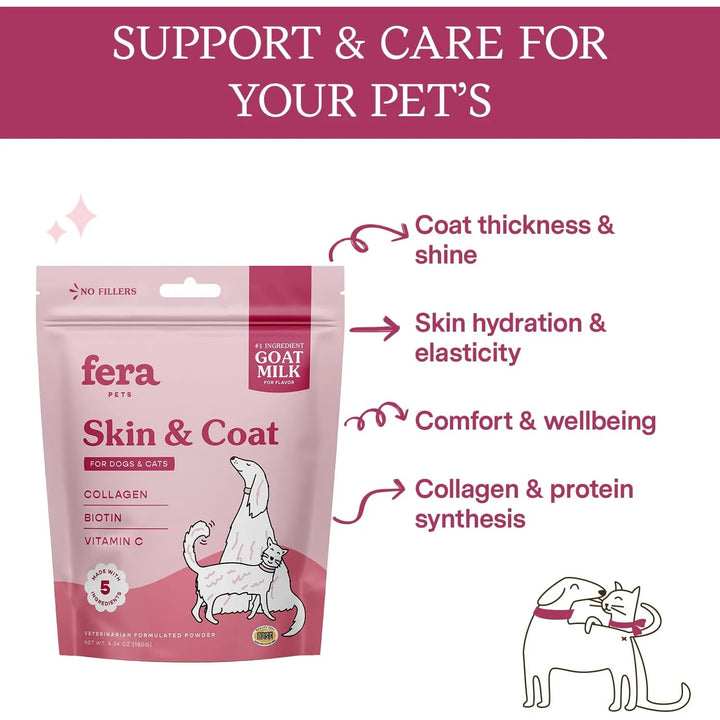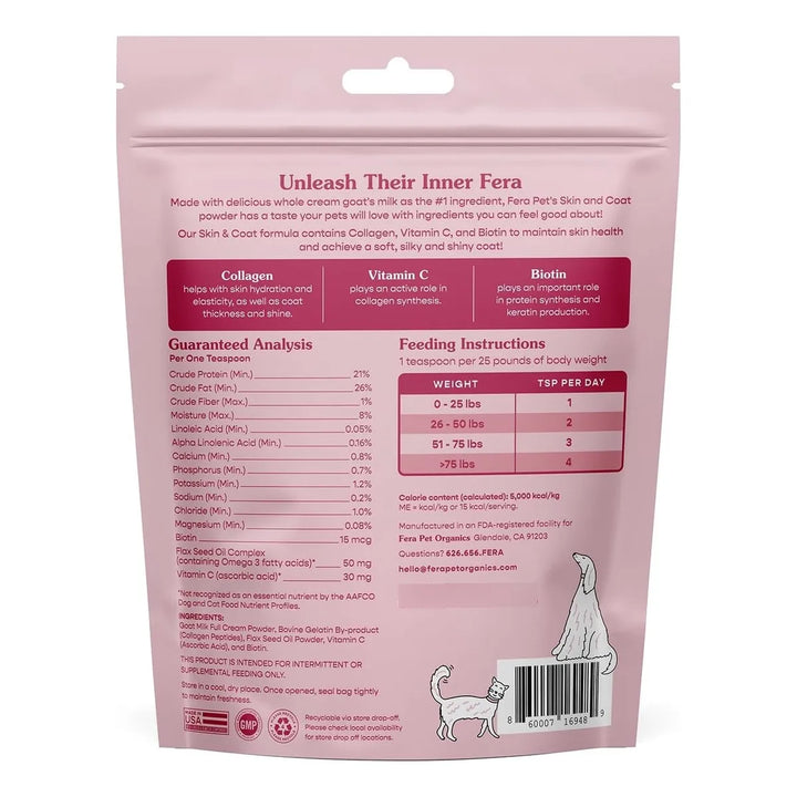 ¿Quieres ver a tu mascota con un pelaje brillante y una piel hidratada? La Leche de Cabra con Colágeno de Fera Pet Organics es la solución que estabas buscando. Formulada por veterinarios, este suplemento no solo mejora la salud de la piel y el pelaje de tu gato o perro, sino que también les encantará su sabor.