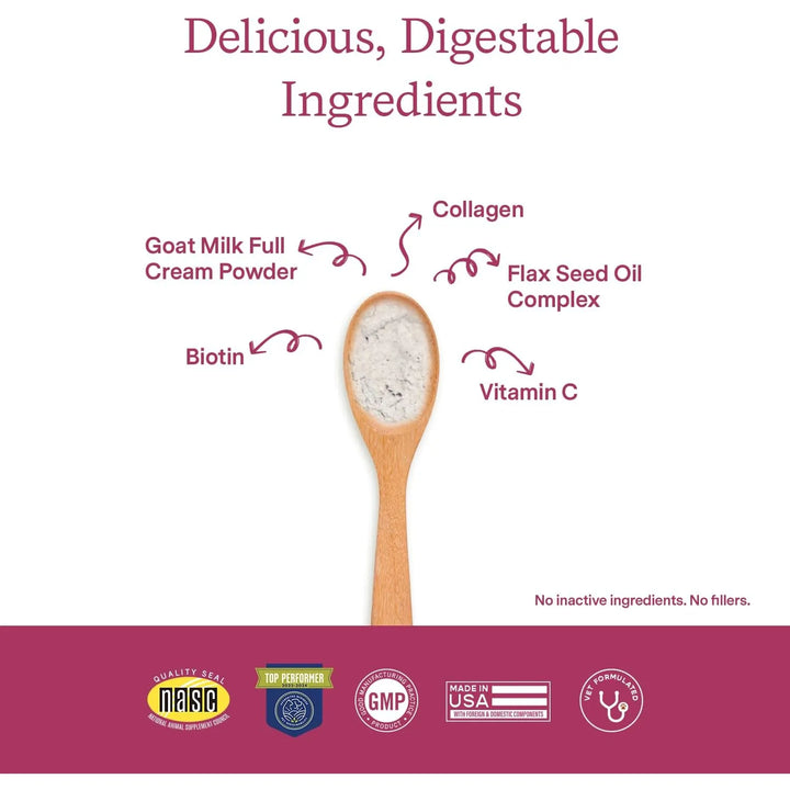 El colágeno en polvo y la biotina trabajan juntos para fortalecer la producción de queratina, esencial para un pelaje grueso y brillante. La vitamina C actúa como antioxidante, mientras que la leche de cabra hidrata desde dentro hacia afuera.