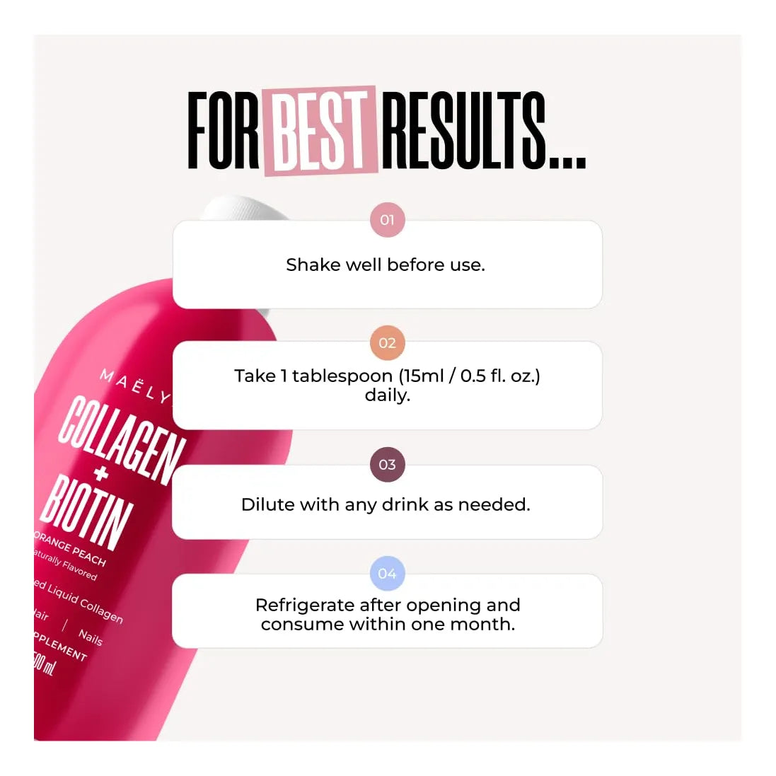 ¿Sueñas con un cabello más fuerte, una piel radiante y uñas que no se rompen al primer descuido? El colágeno líquido súper cargado con biotina de MAËLYS es tu aliado perfecto. Este poderoso suplemento está diseñado para mujeres que buscan resultados visibles sin complicaciones. Imagina despertar cada día con más confianza, sintiendo cómo tu belleza se refleja en cada detalle.