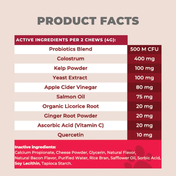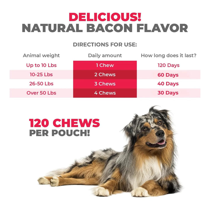 Imagina ver a tu perro jugar sin molestias, libre de esa picazón constante que lo agobia. Con ingredientes activos como probióticos, calostro y omega-3, estos masticables actúan desde adentro para mejorar su piel, pelaje y digestión. Además, su delicioso sabor a tocino los convierte en un premio que tu perro amará.