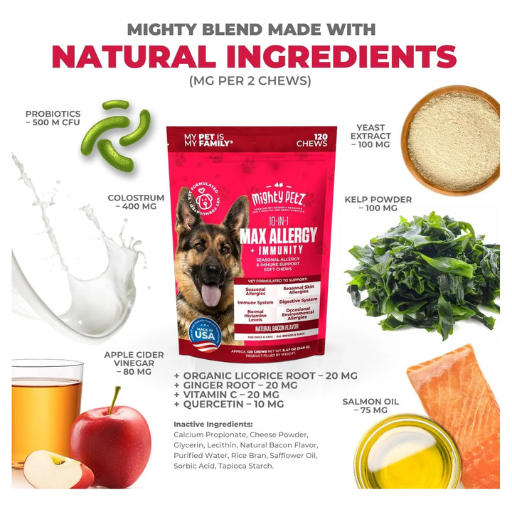 Los masticables actúan directamente sobre las causas de las alergias, regulando la respuesta del sistema inmunológico y reduciendo la producción de histamina. Los probióticos mejoran la digestión, mientras que el omega-3 y el calostro nutren la piel y el pelaje desde dentro.