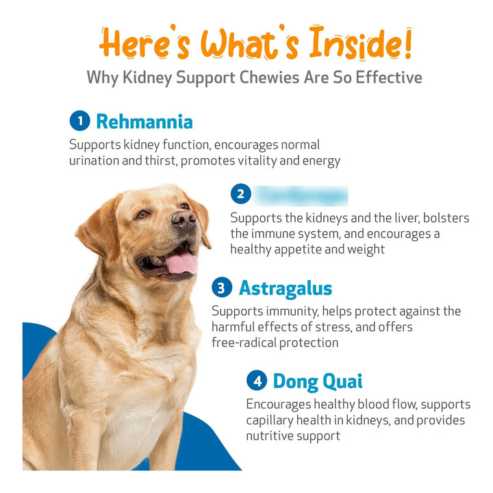 ¿Te preocupa ver a tu fiel compañero canino con poca energía o problemas renales? Sabemos lo doloroso que es verlos sufrir. Por eso, nuestros Masticables de Apoyo Renal para Perros están formulados para devolverle la vitalidad y el equilibrio que merece. Con ingredientes como rehmannia y astrágalo, respaldados por la medicina tradicional asiática y la ciencia veterinaria, este producto no solo alivia síntomas, sino que actúa desde la raíz para mantener su función renal saludable.