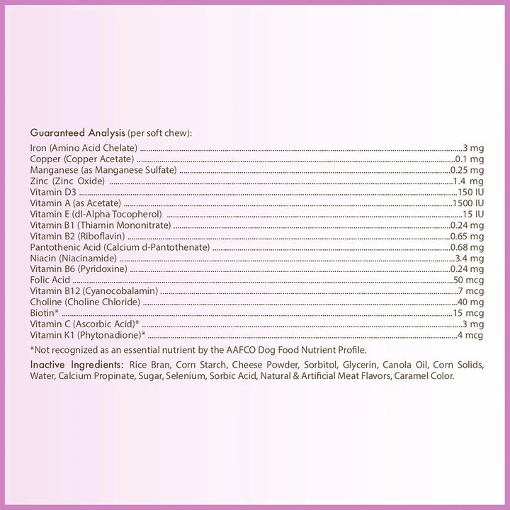Nuestros Masticables Multivitamínicos actúan proporcionando una dosis diaria de nutrientes esenciales que muchas dietas comerciales no cubren. Al administrarse regularmente, estos suplementos ayudan a equilibrar la nutrición de tu perro, mejorando su sistema inmunológico, promoviendo un pelaje brillante y apoyando una digestión saludable.