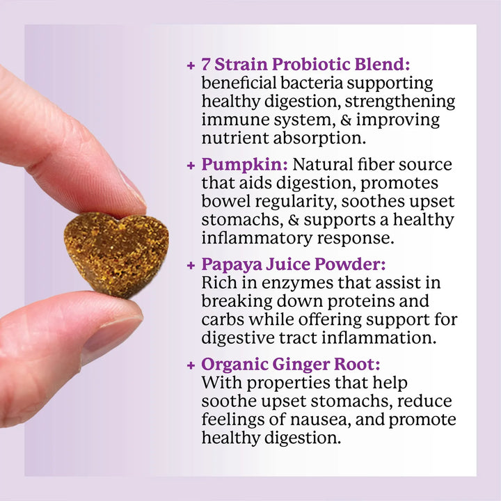 Los probióticos en estos masticables trabajan para equilibrar la flora intestinal de tu perro, promoviendo una digestión saludable y reduciendo problemas como la diarrea. Las enzimas digestivas y los prebióticos ayudan a descomponer los alimentos y absorber nutrientes, mientras que los ingredientes ricos en fibra como la calabaza y la manzana apoyan la regularidad intestinal.