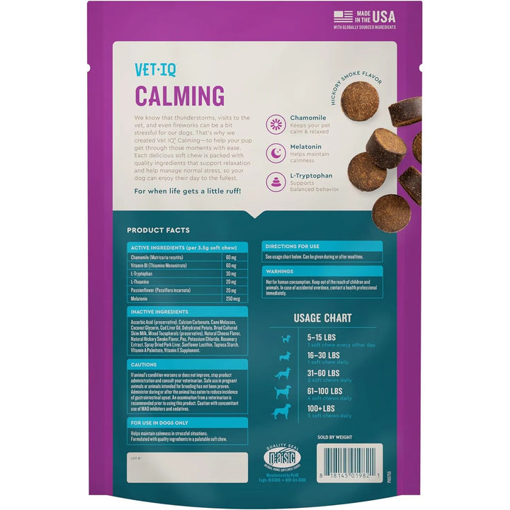 Los masticables VetIQ contienen ingredientes activos que actúan sobre el sistema nervioso de tu perro, ayudando a equilibrar sus niveles de estrés y promoviendo un estado de calma natural. Su fórmula está diseñada para ser administrada diariamente, brindando un apoyo constante contra la ansiedad.