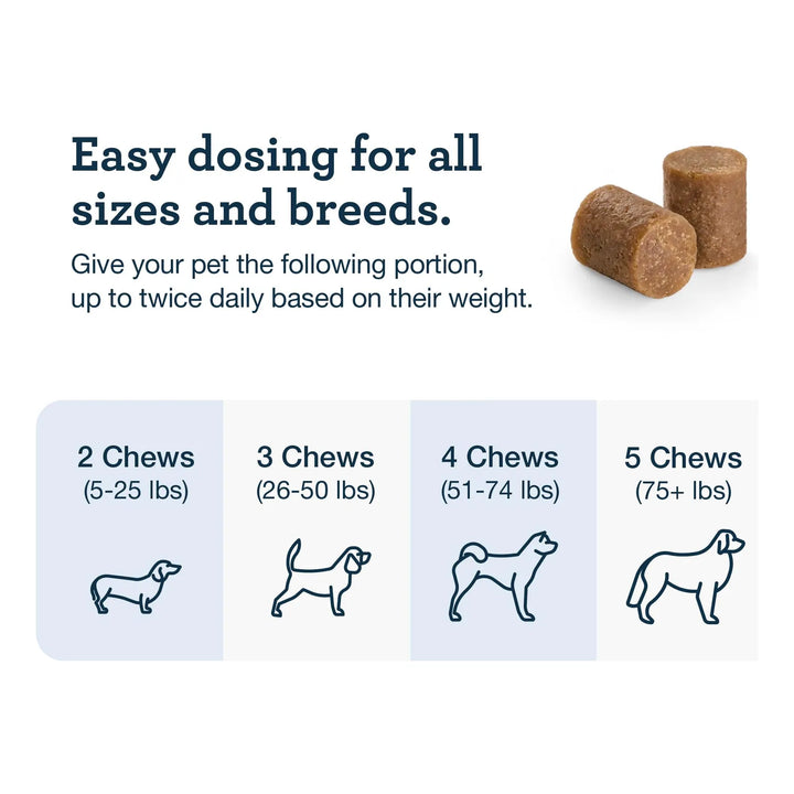 - Determina el peso de tu perro para calcular la dosis diaria (2 masticables para pequeños, 5 para razas gigantes).
