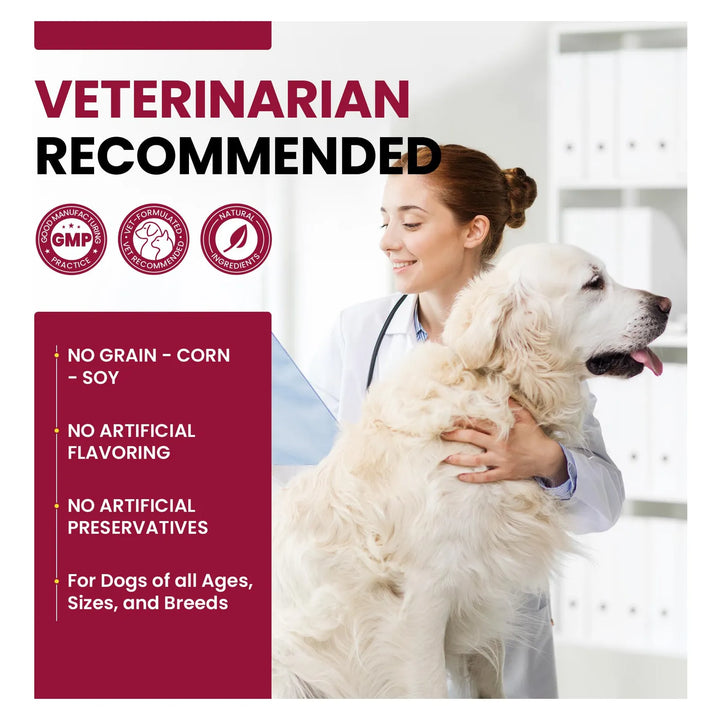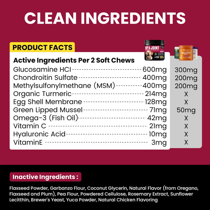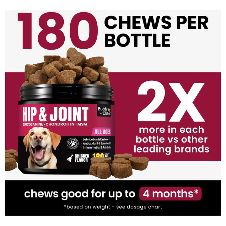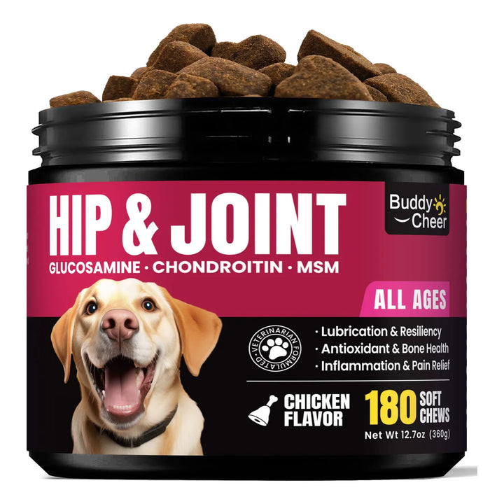 Imagina a tu compañero jugando como cachorro otra vez, sin rigidez ni molestias. Cada masticable está diseñado para aliviar el dolor, reducir la inflamación y reparar el tejido dañado, gracias a una combinación poderosa de ingredientes naturales como glucosamina, condroitina, ácido hialurónico y cúrcuma. ¡Y con 180 unidades por botella, tendrás hasta 4 meses de cuidado continuo!