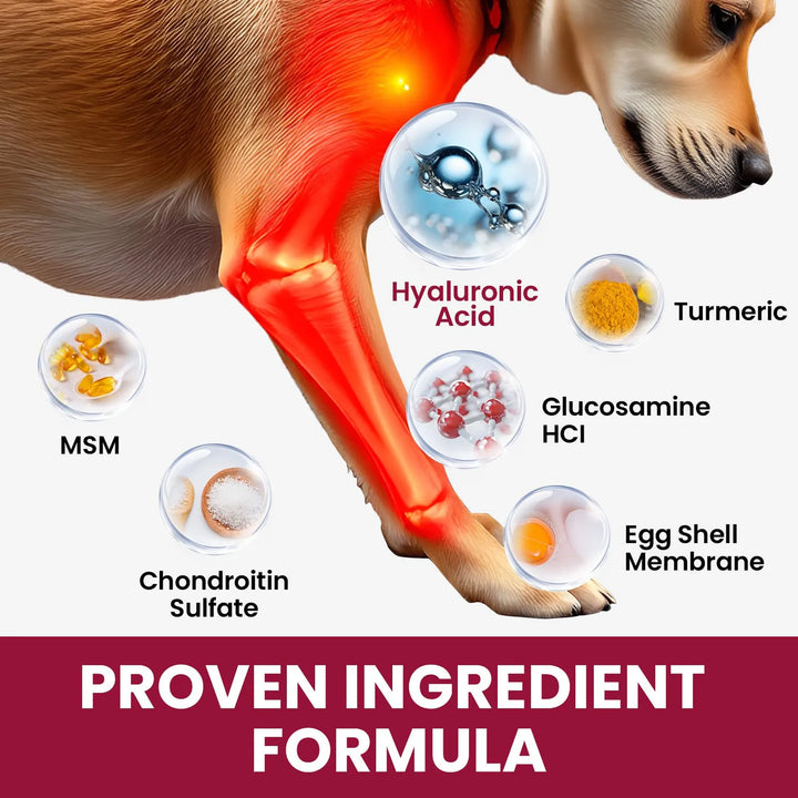 La glucosamina y condroitina trabajan en sinergia para reconstruir el cartílago desgastado, mientras el MSM reduce la inflamación. El ácido hialurónico actúa como lubricante natural, y la cúrcuma potencia el efecto antiinflamatorio. ¡Es como un equipo de élite para las articulaciones de tu perro!