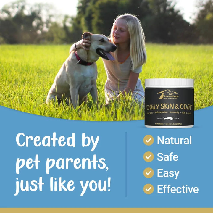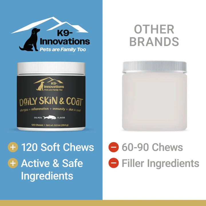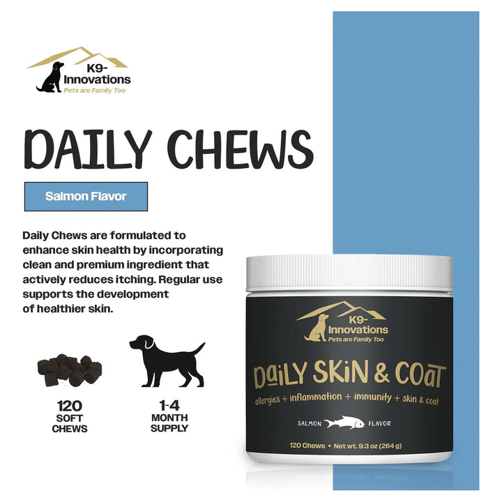 ¿Tu perro no deja de rascarse? ¿Su piel luce irritada o su pelaje ha perdido brillo? Los masticables K9-Innovations son la solución natural que estabas buscando. Formulados con ingredientes premium como salmón rico en Omega 3 y vitamina C, estos deliciosos snacks no solo calman la picazón al instante, sino que nutren desde adentro para una piel radiante y un sistema inmunológico fuerte.