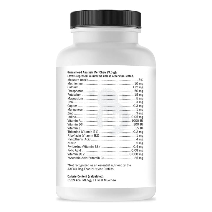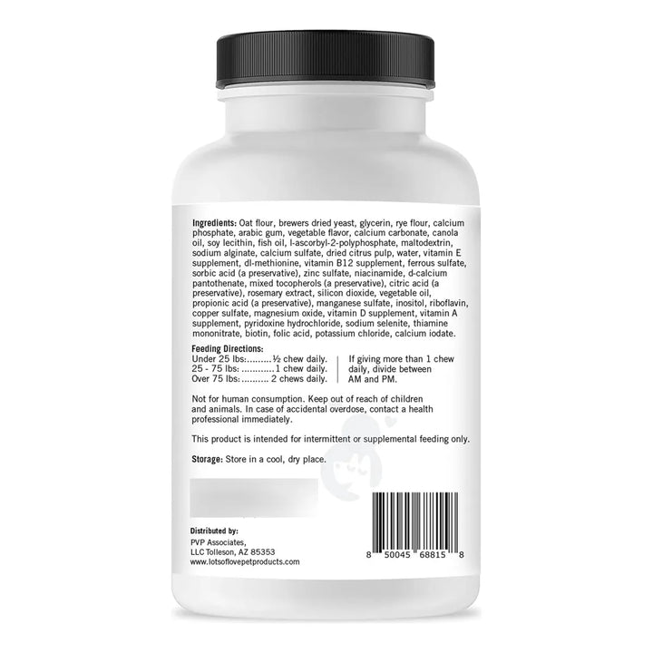 Nuestros masticables actúan como un refuerzo nutricional completo. Cada tableta está diseñada para liberar vitaminas y minerales de manera gradual, asegurando que tu perro absorba todo lo que necesita para mantenerse activo y saludable. La combinación de nutrientes como omega-3, vitaminas del complejo B y antioxidantes trabaja en sinergia para mejorar su pelaje, fortalecer sus defensas y optimizar su digestión.