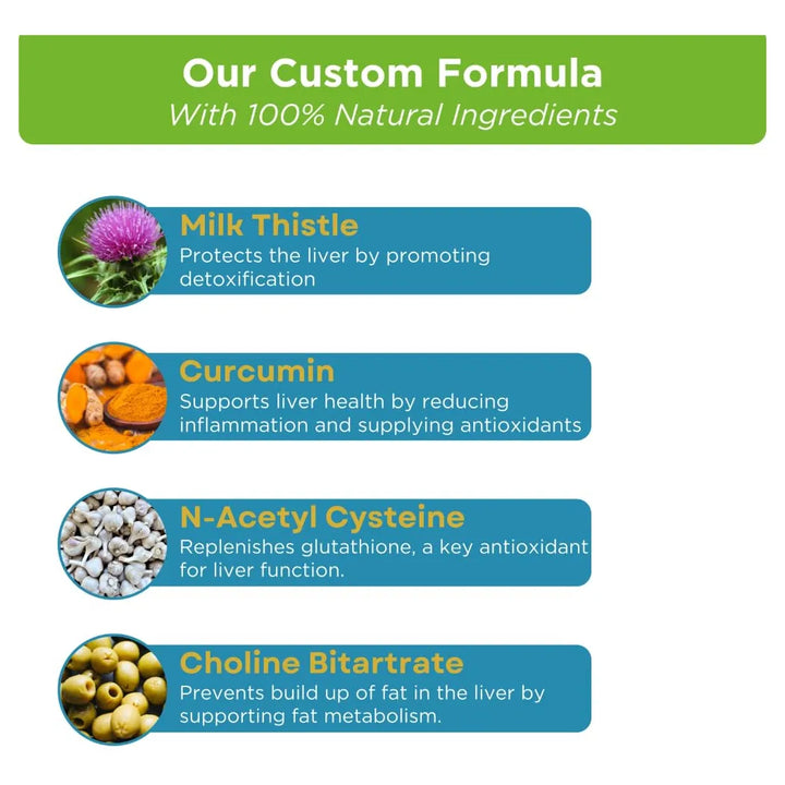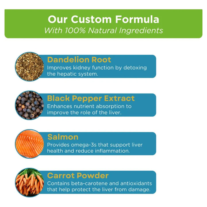 El cardo mariano actúa como un potente antioxidante, protegiendo el hígado del estrés oxidativo y promoviendo la regeneración celular. La curcumina reduce la inflamación, mientras que el aceite de salmón aporta ácidos grasos esenciales para una piel y pelaje saludables. La raíz de diente de león y el NAC trabajan en conjunto para desintoxicar los riñones y mejorar la función urinaria.