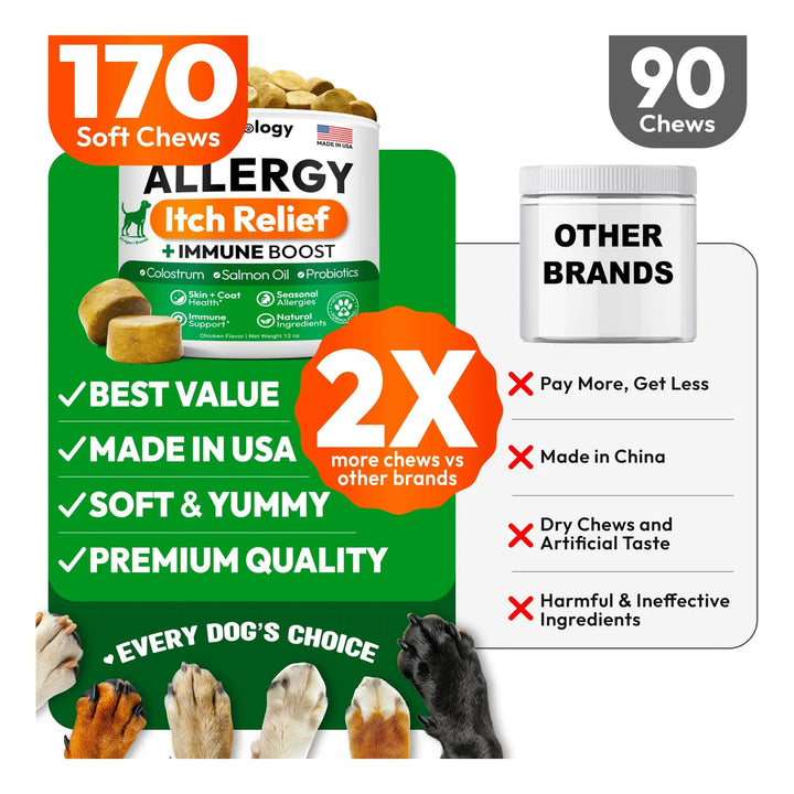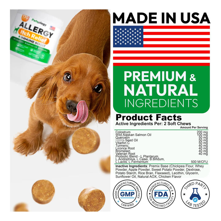 Imagina a tu perro feliz, cómodo y libre de molestias. Nuestros masticables están repletos de ingredientes naturales como aceite de pescado Omega 3 y probióticos, que trabajan juntos para reducir el enrojecimiento, nutrir la piel y promover un pelaje brillante. Además, al estar fabricados en los Estados Unidos en instalaciones registradas por la FDA, puedes estar seguro de que estás dando a tu mascota un producto seguro y confiable.