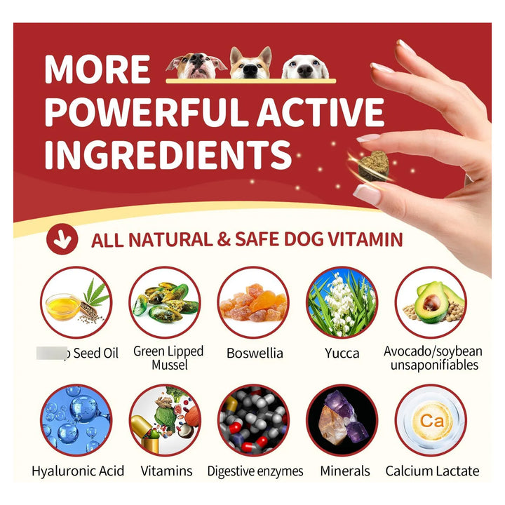Este potente suplemento combina ingredientes clínicamente probados como el mejillón de labios verdes, la cúrcuma orgánica y el aceite de cáñamo, que trabajan en sinergia para reducir la inflamación, reparar el cartílago y lubricar las articulaciones desde dentro. Imagina a tu perro volviendo a perseguir su pelota favorita o subiendo las escaleras sin quejarse. Ese es el poder de una fórmula pensada para su bienestar.