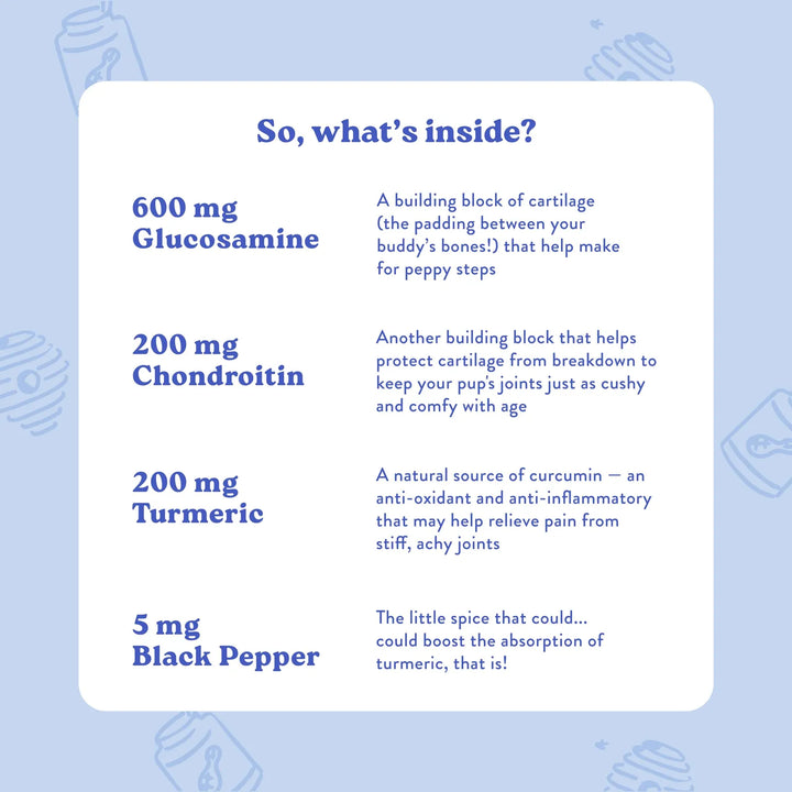 Nuestros masticables están formulados con ingredientes clínicamente probados como glucosamina, MSM y condroitina, diseñados para apoyar la salud articular y mejorar la movilidad. No es solo un suplemento, es una muestra de amor hacia tu mascota. Cada bocado está horneado en los Estados Unidos con ingredientes 100% naturales, sin conservantes ni sabores artificiales. Porque tu perro merece lo mejor, sin compromisos.
