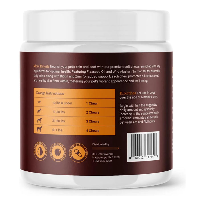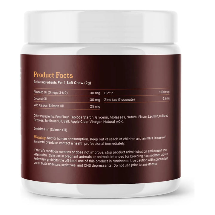 Imagina a tu perro con un pelaje suave, brillante y lleno de vida, sin rastros de sequedad o irritación. Nuestros masticables están formulados con ingredientes premium como aceite de salmón salvaje de Alaska, rico en Omega-3, y aceite de linaza, conocido por sus propiedades hidratantes. Además, la biotina y el zinc trabajan en conjunto para fortalecer su pelaje desde la raíz, reduciendo la caída y promoviendo un crecimiento saludable.
