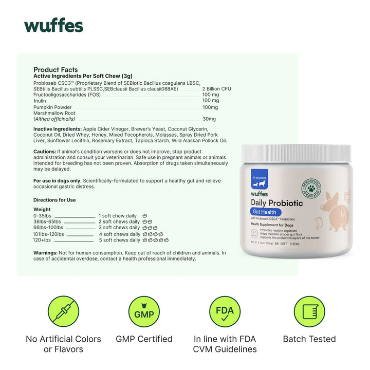 Cada masticable es una combinación poderosa de probióticos clínicamente probados, prebióticos y ingredientes naturales como la raíz de malvavisco y el polvo de calabaza. Estos componentes trabajan en armonía para calmar irritaciones, promover una digestión suave y asegurar que tu mascota absorba todos los nutrientes que necesita. No es solo un suplemento, es un acto de amor hacia quien llena tus días de alegría.