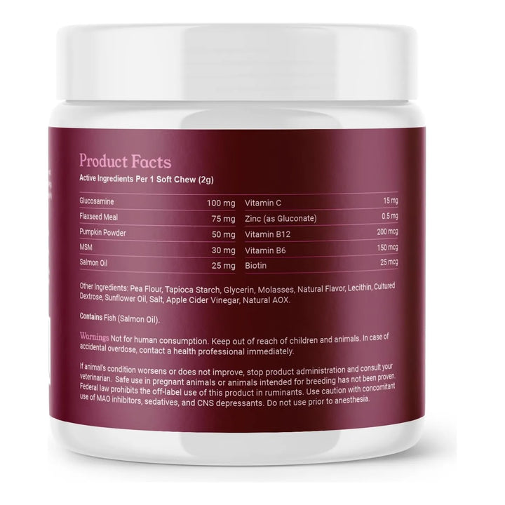Imagina a tu perro disfrutando de un snack que no solo es irresistible, sino que también lo protege desde adentro. Con ingredientes como vitamina C, zinc, harina de semillas de hinojo, cúrcuma y vinagre de sidra de manzana, estos masticables son un apoyo natural contra alergias estacionales y un refuerzo para su bienestar general. Además, incluyen vitaminas B, biotina, glucosamina, aceite de salmón y polvo de calabaza para mantenerlo activo, saludable y lleno de vitalidad.