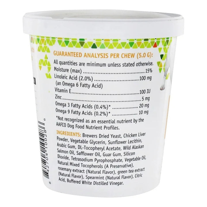 Cada masticable está repleto de ácidos grasos Omega 3 provenientes del aceite de salmón natural de los océanos de Alaska. Estos nutrientes esenciales ayudan a reducir la picazón, el desprendimiento excesivo y promueven un pelaje radiante. Además, son tan sabrosos que tu perro los devorará como si fueran un premio.