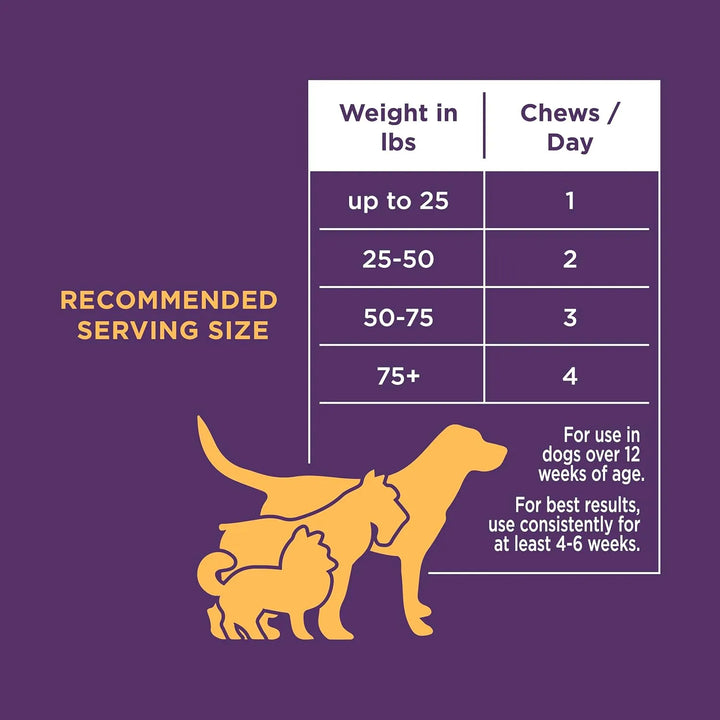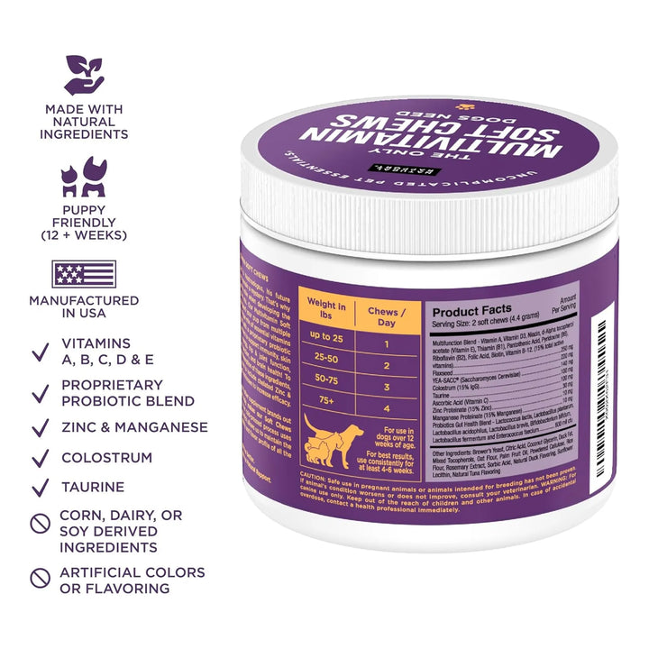 • Beneficios de los masticables multivitaminas: las vitaminas y minerales esenciales se combinan con manganeso y zinc para apoyar la inmunidad, la salud de la piel y el pelaje, la energía, la función de la cadera y las articulaciones, la digestión, la función cardíaca y la salud cerebral
