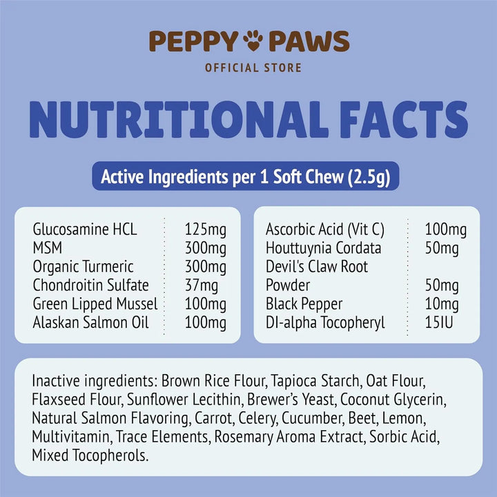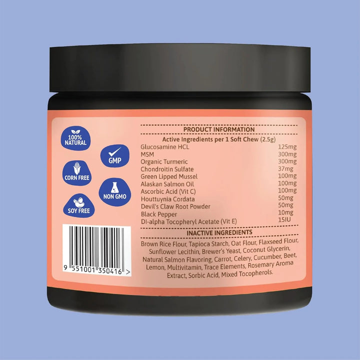 La fórmula única combina glucosamina para reparar el cartílago, MSM para reducir la inflamación, condroitina para mejorar la lubricación y cúrcuma como antioxidante natural. Es como un abrazo terapéutico para sus articulaciones, diseñado por expertos en salud canina y fabricado con los más altos estándares de calidad.