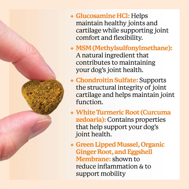 Los masticables actúan directamente en las articulaciones de tu perro. La glucosamina y la condroitina estimulan la producción de líquido sinovial, que lubrica y nutre el cartílago. El MSM reduce la inflamación, mientras que el mejillón de labios verdes aporta nutrientes esenciales para la recuperación muscular. Con el uso diario, tu perro recuperará su movilidad y vitalidad en pocas semanas.