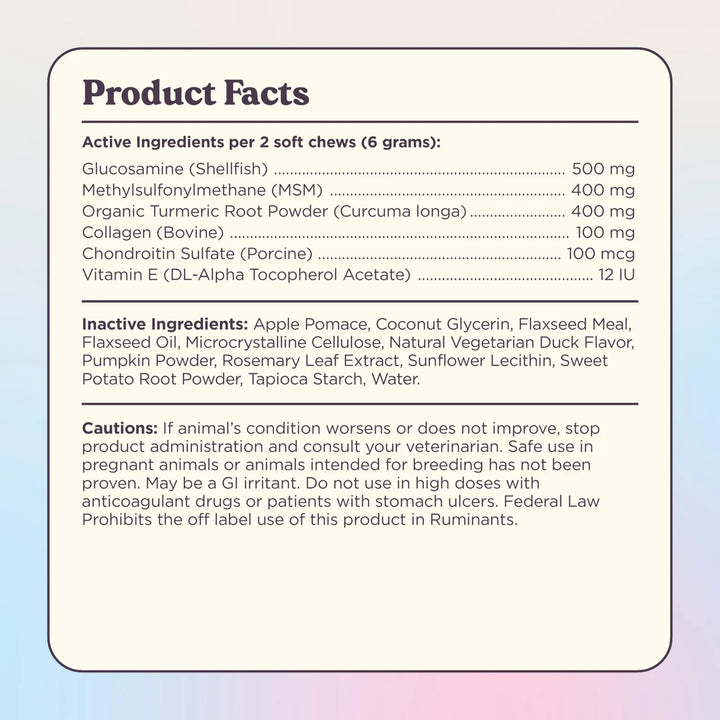 Imagina ver a tu perro saltando de emoción como cuando era cachorro, jugando sin molestias y disfrutando cada paseo. Nuestra fórmula única no solo alivia las molestias articulares, sino que también nutre desde dentro, gracias a ingredientes como el colágeno de vacas criadas en pastos, la cúrcuma y los ácidos grasos omega-3. Sin rellenos ni ingredientes artificiales, es el regalo de salud que tu mascota se merece.