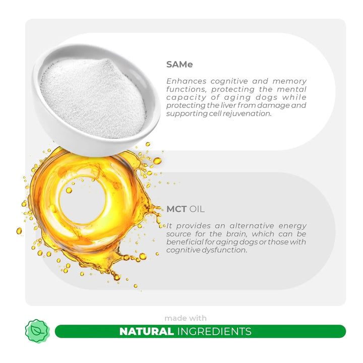 ¿Te preocupa ver a tu mascota lenta o con dificultades para aprender nuevos trucos? La función cognitiva puede disminuir con la edad, pero con SAMe, tu perro mantendrá su mente alerta y su cuerpo activo. Además, el aceite MCT asegura que cada componente se absorba rápidamente, maximizando los resultados desde la primera dosis.