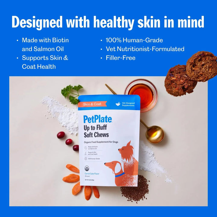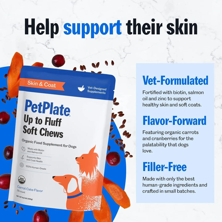¿Tu perro sufre de piel seca, pelaje opaco o alergias? Sabemos lo frustrante que puede ser ver a tu mejor amigo peludo incómodo. Imagina poder darle un suplemento delicioso que no solo lo hará saltar de alegría, sino que también nutrirá su piel y pelaje desde adentro. Nuestros Masticables Suaves para Perros con Soporte para Piel y Pelaje están diseñados para hacer precisamente eso, con ingredientes de grado humano y formulados por veterinarios.