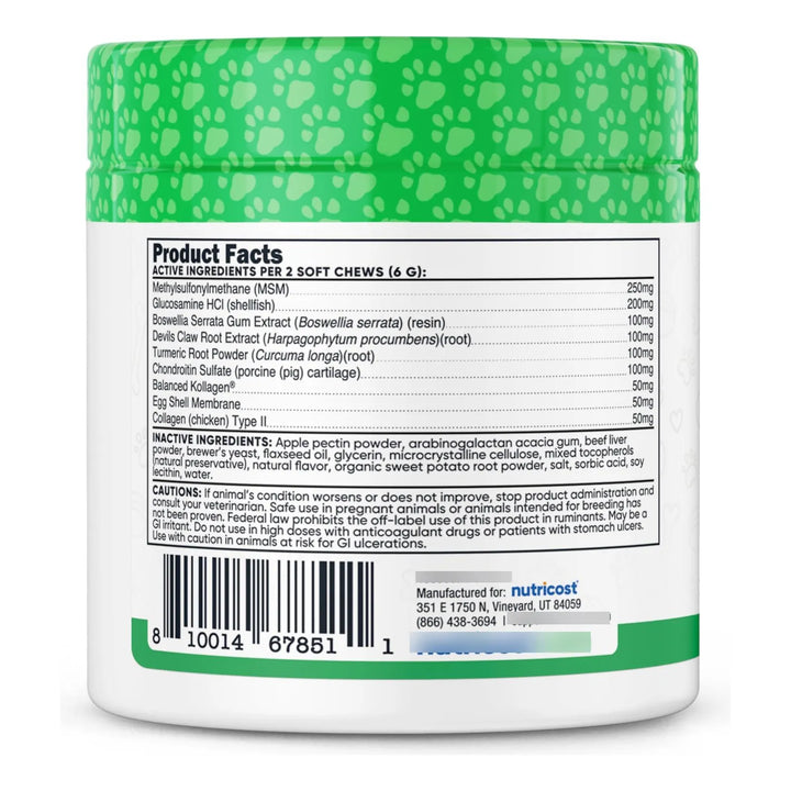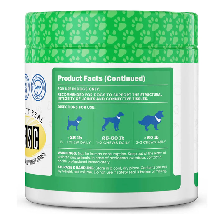 Cada masticable está formulado con ingredientes naturales como glucosamina, condroitina y MSM, conocidos por sus propiedades para fortalecer las articulaciones y reducir la inflamación. Además, incluyen raíz de cúrcuma y Boswellia Serrata, ingredientes respaldados por la ciencia para promover el bienestar general de tu perro.