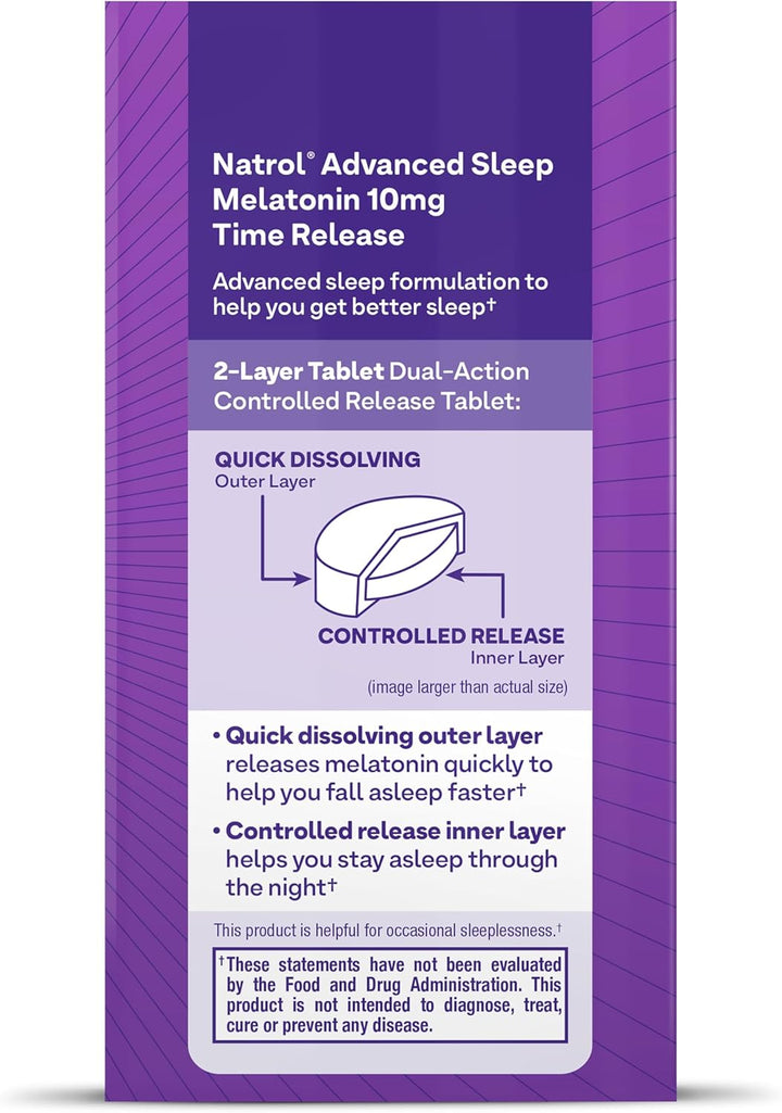 La melatonina de liberación prolongada de Natrol ha sido desarrollada para brindar apoyo durante la noche, con una tecnología bicapa que libera sus ingredientes de forma gradual. La primera capa actúa rápidamente y la segunda se libera con el paso de las horas, ofreciendo un acompañamiento constante. Es una opción práctica y no invasiva que encaja con quienes buscan soluciones suaves, sin complicaciones ni rituales complejos.