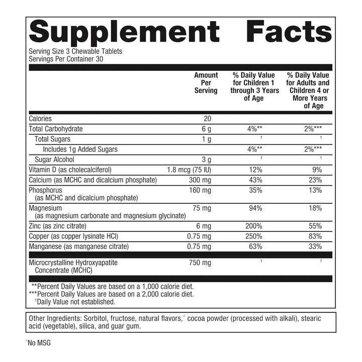 Con cada tableta masticable, estás dando a tu cuerpo una dosis poderosa de hidroxiapatita microcristalina (MCHC), un componente natural del hueso que incluye calcio, fósforo, colágeno y proteínas óseas. Pero eso no es todo: también está enriquecido con vitamina D y magnesio, dos nutrientes clave que mejoran la absorción y el metabolismo del calcio, asegurando que tus huesos reciban todo lo que necesitan para mantenerse fuertes y saludables.