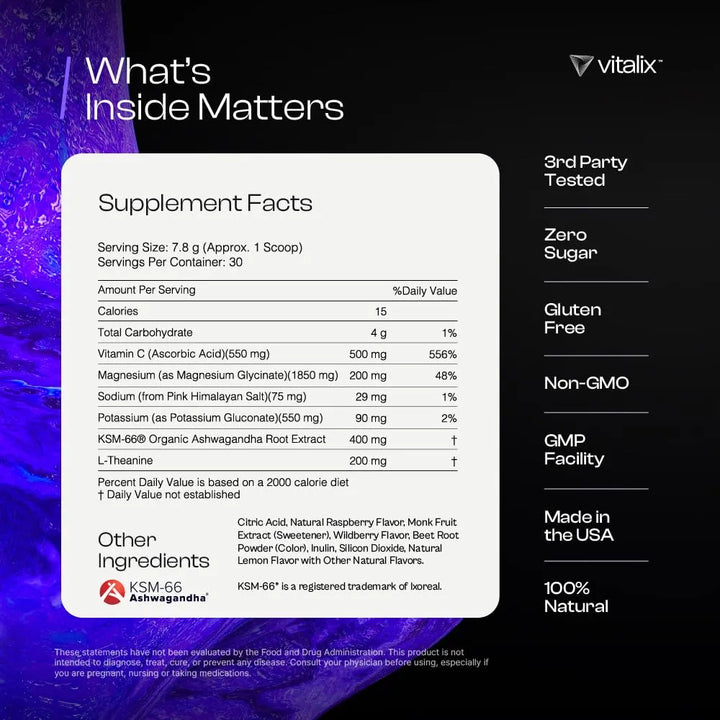 La combinación de Ashwagandha KSM-66 y L-teanina actúa directamente sobre tu sistema nervioso, reduciendo la producción de cortisol (la hormona del estrés) y fomentando un estado de calma. El glicinato de magnesio apoya la relajación muscular, mientras que la vitamina C y el gluconato de potasio fortalecen tu sistema inmunológico y equilibran tus electrolitos.