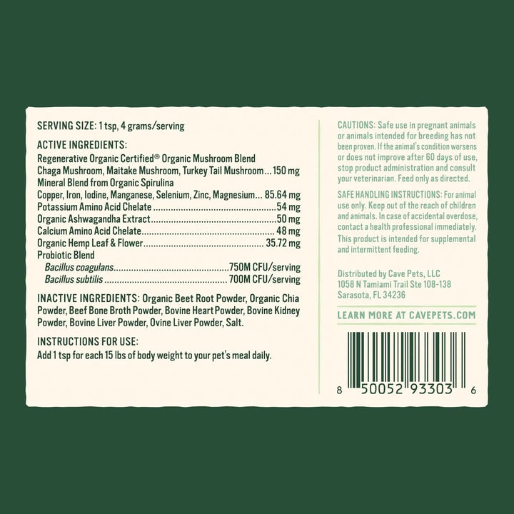 Cada cucharadita de este superblend en polvo está cargada de nutrientes sinérgicos como ashwagandha orgánica, proteínas de cáñamo y minerales biodisponibles de espirulina. Estos ingredientes trabajan juntos para promover una digestión saludable, reducir el estrés y fortalecer su sistema inmunológico. Además, al ser 100% natural y tolerado por la mayoría de los perros, puedes estar seguro de que estás dando lo mejor a tu compañero peludo.